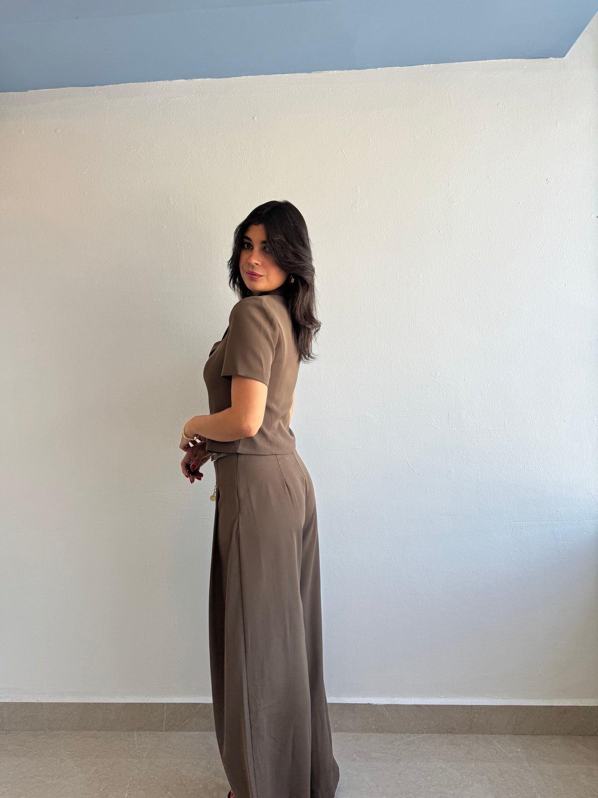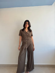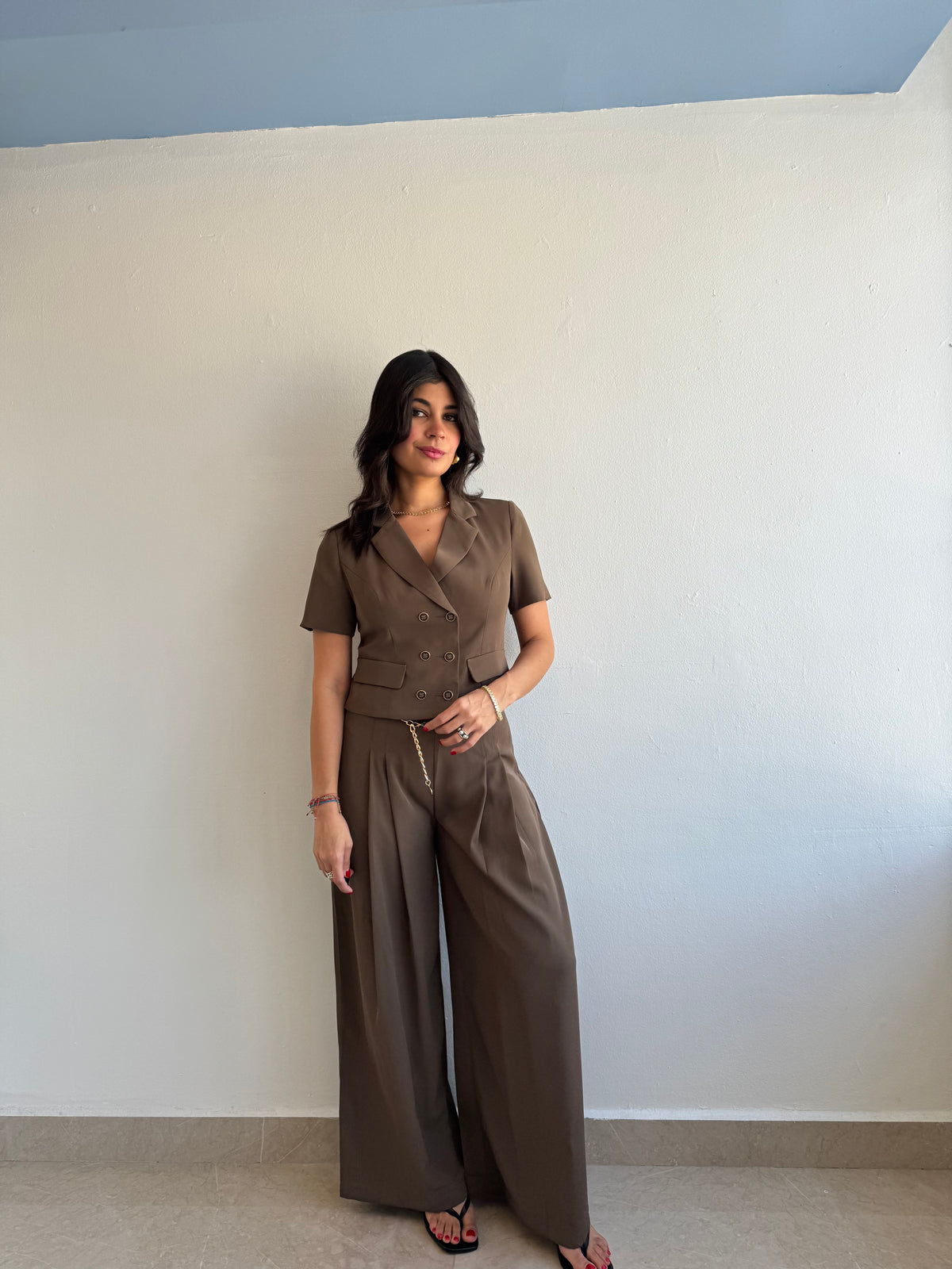 Double breasted short sleeve woven top and pants with gold belt