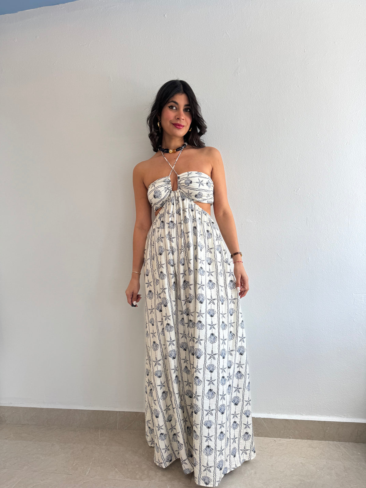 Aqua printed halter neck cut out maxi dress