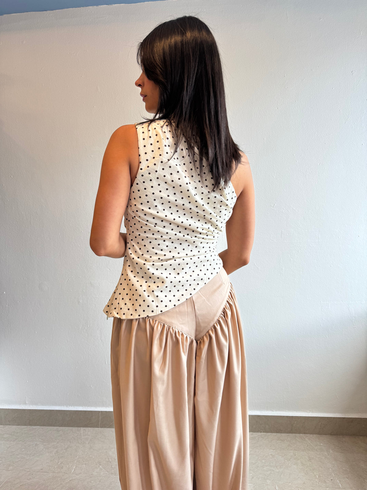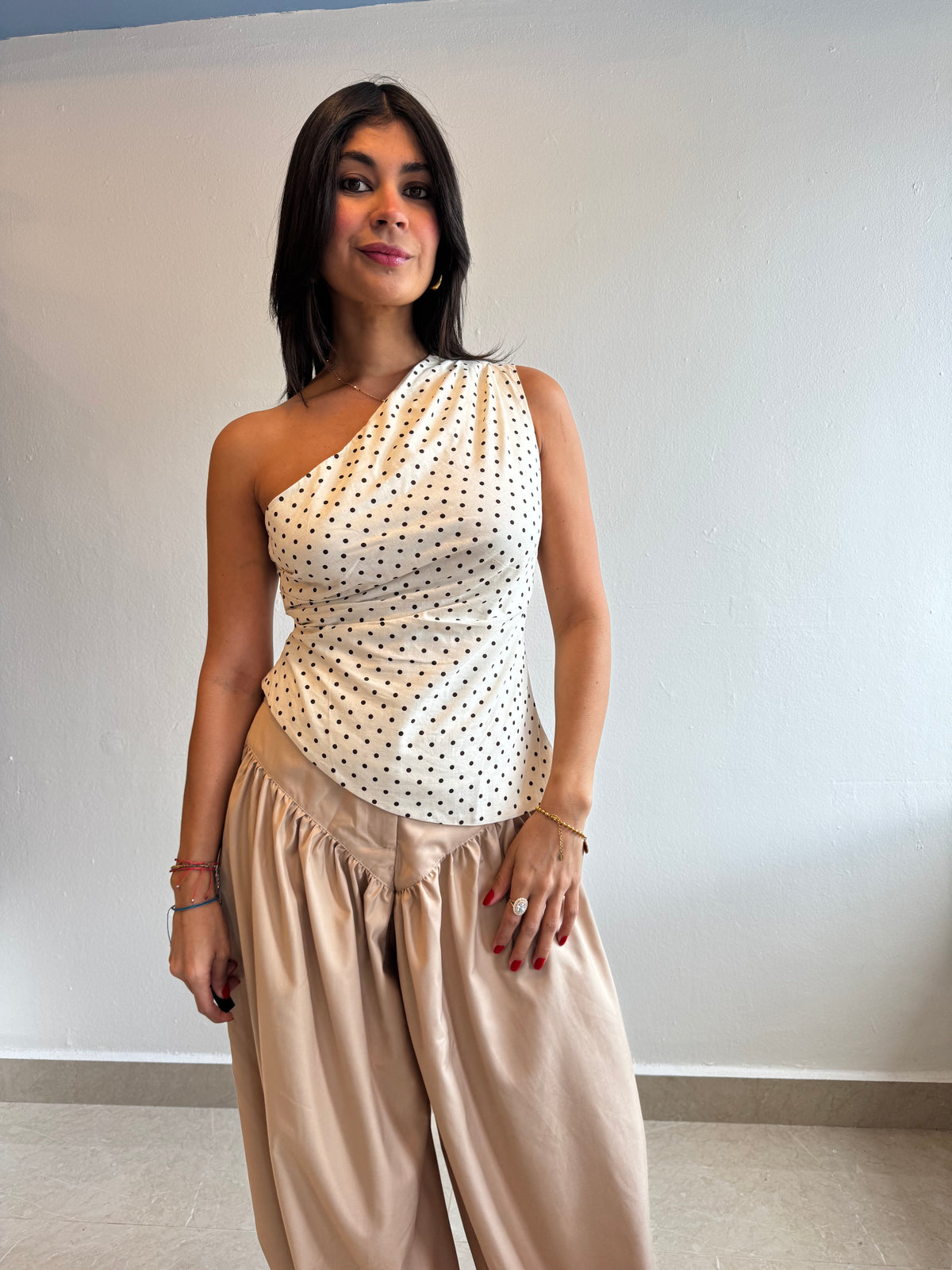 Asymmetrical one shoulder polka dot top