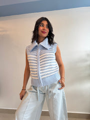 Striped wide collar zip up vest sweater cardigan