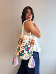 Carteras hechas a mano por diseñadora de Colombia proyectando los colores vivos del caribe.